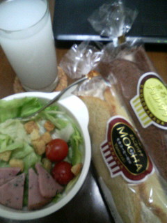 レタスにハムにクルトンまで入れて、ゴマドレッシングかけて、手作りサラダですよ。